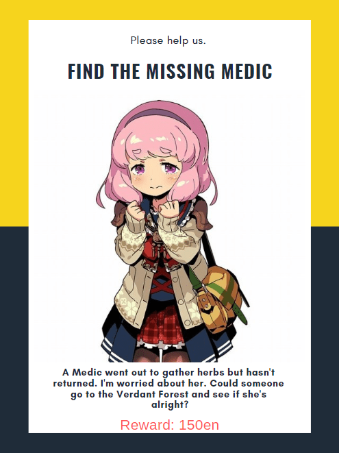 A Medic went out to gather herbs but hasn’t returned. I’m worried about her. Could someone go to the Verdant Forest and see if she’s alright?